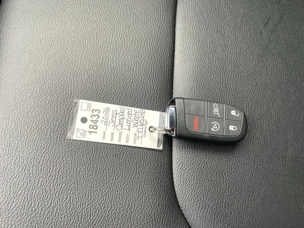 Bright White Clearcoat 2026 Jeep Compass Limited 4WD 8-Speed Automatic 2.0L I4 DOHC 4WD, 10.1 Touchscreen Display, 3.73 Final Drive Ratio, 4-Wheel Disc Brakes, 4G LTE Wi-Fi Hot Spot, 6 Speakers, ABS brakes, Air Conditioning, Alloy wheels, AM/FM radio: SiriusXM, Auto High-beam Headlights, Auto-dimming Rear-View mirror, Automatic temperature control, Black Day Light Opening Moldings, Brake assist, Bumpers: body-color, Compass, Delay-off headlights, Driver door bin, Driver vanity mirror, Dual front impact airbags, Dual front side impact airbags, Electronic Stability Control, Emergency communication system: SiriusXM Guardian, Four wheel independent suspension, Front anti-roll bar, Front Bucket Seats, Front Center Armrest w/Storage, Front dual zone A/C, Front fog lights, Front License Plate Bracket, Front reading lights, Fully automatic headlights, Global Telematics Box Module, Gloss Black Surround/Neutral Gray Rings, Heated door mirrors, Heated front seats, Heated steering wheel, Illuminated entry, Knee airbag, Leather Shift Knob, Leather steering wheel, Leatherette Seats, Limited Altitude Pack, Low tire pressure warning, Neutral Gray Exterior Accents, Neutral Gray Exterior Badging, Occupant sensing airbag, Outside temperature display, Overhead airbag, Overhead console, Panic alarm, ParkView Rear Back-Up Camera, Passenger door bin, Passenger vanity mirror, Piano Black Interior Accents, Power door mirrors, Power driver seat, Power Liftgate, Power steering, Power windows, Premium audio system: UConnect 5, Quick Order Package 29W Limited Altitude, Radio: Uconnect 5 with 10.1 Display, Rain sensing wipers, Rear anti-roll bar, Rear seat center armrest, Rear window defroster, Rear window wiper, Remote keyless entry, Security system, SiriusXM Guardian - Included Trail (B), SiriusXM Radio Service, Speed control, Split folding rear seat, Spoiler, Steering wheel mounted audio controls, Tachometer, Telescoping steering wheel, Tilt steering wheel, Traction control, Trip computer, Turn signal indicator mirrors, Variably intermittent wipers, Wheels: 18 x 7 Painted Diamond Cut Aluminum, Wheels: 19 x 7.5 Aluminum Painted, 4WD.