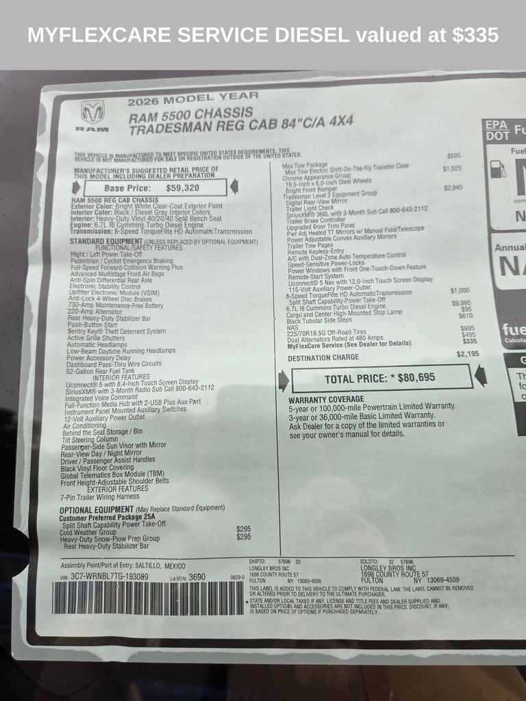 This Vehicle Features Chrome Appearance Group (19.5 x 6.0 Steel Wheels, Bright Front Bumper, Center Hub, and Chrome Grille Surround), Cold Weather Group (Engine Block Heater and MOPAR Winter Front Grille Cover), Heavy Duty Snow Plow Prep Group (Heavy Duty Front Suspension Group and Upgraded Rear HD Stabilizer Bar), Max Tow Package (Trailer Brake Control and Trailer Light Check), Quick Order Package 25A Tradesman, Tradesman Level 2 Equipment Group (115V Auxiliary Power Outlet, 12.0 Touchscreen Display, 400W Inverter, 4G LTE Wi-Fi Hot Spot, Apple CarPlay, Black Exterior Mirrors, Black Power Heated Fold Telescope Mirrors, Connectivity - US/Canada, Digital Rearview Mirror, Disassociated Touchscreen Display, Exterior Mirrors Courtesy Lamps, For Details, Visit DriveUconnect.com, For More Info, Call 800-643-2112, Front 1-Touch Down Power Windows, Google Android Auto, GPS Antenna Input, GPS Navigation, HD Radio, Manual Folding Exterior Mirrors, Mirror Running Lights, Off-Road Info Pages, Power Adjust Mirrors, Power-Adjustable Convex Aux Mirrors, Remote Keyless Entry, Remote Start System, SiriusXM Radio Service, Speed Sensitive Power Locks, Tinted Acoustic Windshield Glass, Trailer Tow Pages, and Upgraded Door Trim Panel), 4 Speakers, 4-Wheel Disc Brakes, 4.44 Axle Ratio, 40/20/40 Split Bench Seat, ABS brakes, Air Conditioning, AM/FM radio: SiriusXM, Apple CarPlay/Android Auto, Black Tubular Side Steps, Compass, Delay-off headlights, Driver door bin, Dual front impact airbags, Dual rear wheels, Electronic Stability Control, Emergency communi