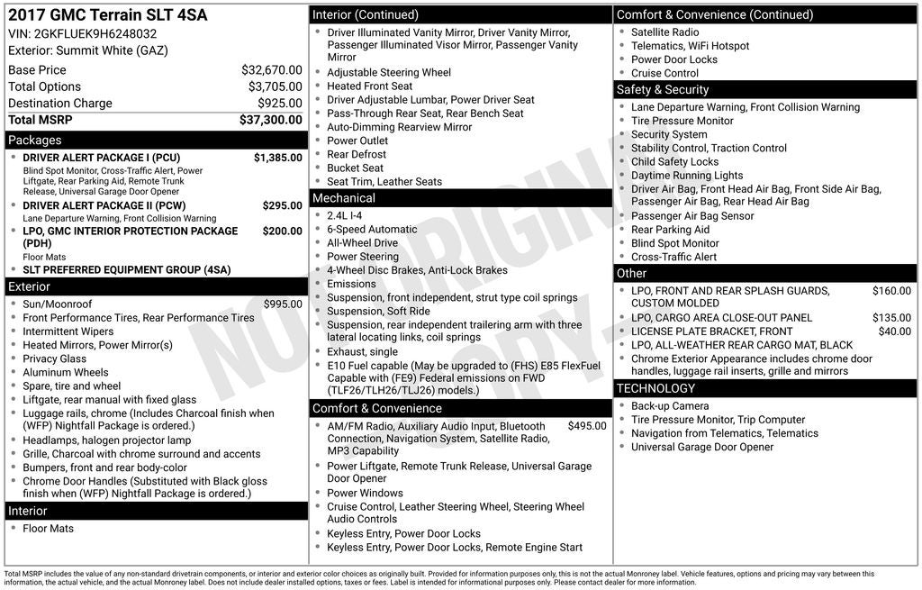Summit White 2017 GMC Terrain SLT AWD 6-Speed Automatic 2.4L 4-Cylinder SIDI DOHC VVT AWD, 3.53 Axle Ratio, 4-Wheel Disc Brakes, 8 Speakers, 8-Way Power Driver Seat Adjuster, ABS brakes, Air Conditioning, All-Weather Floor Mats, Alloy wheels, AM/FM radio: SiriusXM, Auto-dimming Rear-View mirror, Automatic temperature control, Black All-Weather Rear Cargo Mat (LPO), Bluetooth® For Phone, Brake assist, Bumpers: body-color, Cargo Area Close-Out Panel (LPO), Chrome Luggage Rails, Chrome Power-Adjustable Heated Outside Mirrors, Compass, Delay-off headlights, Driver Alert Package I, Driver Alert Package II, Driver door bin, Driver vanity mirror, Dual front impact airbags, Dual front side impact airbags, E10 Fuel Capable, Electronic Stability Control, Emergency communication system: OnStar Guidance, Exterior Parking Camera Rear, Forward Collision Alert & Lane Departure Warning, Four wheel independent suspension, Front & Rear Custom Molded Splash Guards, Front anti-roll bar, Front Bucket Seats, Front Center Armrest, Front License Plate Bracket, Front reading lights, Fully automatic headlights, GMC Interior Protection Package (LPO), Heated door mirrors, Heated Driver & Front Passenger Seats, Heated front seats, Illuminated entry, IntelliLink, Leather-Wrapped Steering Wheel, Low tire pressure warning, Occupant sensing airbag, Outside temperature display, Overhead airbag, Panic alarm, Passenger door bin, Passenger vanity mirror, Perforated Leather-Appointed Seat Trim, Pioneer Premium 8-Speaker System, Power door mirrors, Power driver seat, Power Programmable Rear Liftgate, Power steering, Power Tilt-Sliding Sunroof w/Express Open, Power windows, Preferred Equipment Group 4SA, Radio data system, Radio: Color Touch AM/FM Stereo, Radio: Color Touch AM/FM Stereo w/Navigation, Rear anti-roll bar, Rear Cross-Traffic Alert, Rear Park Assist, Rear seat center armrest, Rear window defroster, Rear window wiper, Remote keyless entry, Remote Vehicle Start, Roof rack: rails only, Security system, Side Blind Zone Alert, Single-Zone Automatic Climate Control, SiriusXM Satellite Radio, Speed control, Speed-sensing steering, Split folding rear seat, Spoiler, Steering wheel mounted audio controls, Tachometer, Telescoping steering wheel, Tilt steering wheel, Traction control, Trip computer, Universal Home Remote, Variably intermittent wipers, Wheels: 18 x 7 Aluminum (4), AWD.