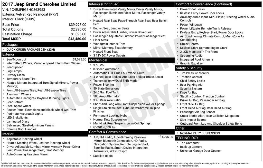 Velvet Red Pearlcoat 2017 Jeep Grand Cherokee Limited 4WD 8-Speed Automatic 3.6L V6 24V VVT 4WD, 1-Year SiriusXM Radio Service, 3.45 Rear Axle Ratio, 4-Wheel Disc Brakes, 5-Year SiriusXM Traffic Service, 5-Year SiriusXM Travel Link Service, 6 Month Trial (Registration Required), 6 Speakers, 8.4 Touchscreen Display, ABS brakes, Air Conditioning, Alloy wheels, AM/FM radio: SiriusXM, Anti-whiplash front head restraints, Audio memory, Auto-dimming door mirrors, Auto-Dimming Rear-View Mirror, Auto-dimming Rear-View mirror, Automatic temperature control, Brake assist, Bumpers: body-color, Compass, Delay-off headlights, Driver door bin, Driver vanity mirror, Dual front impact airbags, Dual front side impact airbags, Electronic Stability Control, Engine Oil Cooler, For Details Visit DriveUconnect.com, For More Info, Call 800-643-2112, Four wheel independent suspension, Front anti-roll bar, Front Bucket Seats, Front Center Armrest w/Storage, Front dual zone A/C, Front fog lights, Front reading lights, Fully automatic headlights, Garage door transmitter, GPS Antenna Input, GPS Navigation, HD Radio, Heated door mirrors, Heated front seats, Heated rear seats, Heated steering wheel, Illuminated entry, Instrument Cluster w/Off-Road Disp. Pages, Integrated Voice Command w/Bluetooth®, Knee airbag, Leather Shift Knob, Leather Trimmed Bucket Seats, Low tire pressure warning, Memory seat, Normal Duty Suspension, Occupant sensing airbag, Outside temperature display, Overhead airbag, Overhead console, Panic alarm, ParkView Rear Back-Up Camera, Passenger door bin, Passenger vanity mirror, Power door mirrors, Power driver seat, Power Liftgate, Power passenger seat, Power steering, Power Sunroof, Power windows, Quick Order Package 23H, Radio data system, Radio: Uconnect 3 w/5 Display, Radio: Uconnect 3C Nav w/8.4 Display, Rear anti-roll bar, Rear reading lights, Rear seat center armrest, Rear window defroster, Rear window wiper, Remote keyless entry, Roadside Assistance & 9-1-1 Call, Roof rack: rails only, Security system, SiriusXM Satellite Radio, SiriusXM Traffic, SiriusXM Travel Link, Speed control, Speed-Sensitive Wipers, Split folding rear seat, Spoiler, Steering wheel mounted audio controls, Tachometer, Telescoping steering wheel, Tilt steering wheel, Traction control, Trip computer, Turn signal indicator mirrors, Uconnect Access, Variably intermittent wipers, Wheels: 18 x 8.0 Tech Gray Aluminum, 4WD.