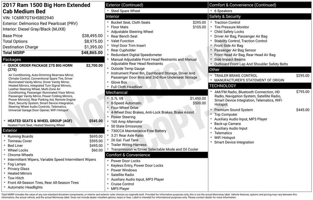 Delmonico Red Pearlcoat 2017 Ram 1500 Big Horn 4WD 8-Speed Automatic HEMI 5.7L V8 Multi Displacement VVT 1 Year Trial (Registration Required), 115V Auxiliary Power Outlet, 17 x 7 Aluminum Wheels, 20 x 8 Chrome Clad Aluminum Wheels, 3.21 Rear Axle Ratio, 4-Wheel Disc Brakes, 40/20/40 Split Bench Seat, 5-Year SiriusXM Traffic Service, 5-Year SiriusXM Travel Link Service, 6 Month Trial (Registration Required) (3B2), 6 Month Trial (Registration Required) (X9J), 6 Speakers, 8.4 Touchscreen Display, 9 Alpine Speakers w/Subwoofer, ABS brakes, Active Grille Shutters, Air Conditioning, Air Conditioning ATC w/Dual Zone Control, Alloy wheels, AM/FM radio, Audio Jack Input for Mobile Devices, Auto-Dimming Exterior Mirrors, Auto-Dimming Rear-View Mirror, Big Horn Badge, Big Horn Regional Package, Black Exterior Mirrors, Brake assist, Bright/Bright Billets Grille, Bumpers: chrome, Center Hub, Charge Only Remote USB Port, Class IV Receiver Hitch, Cloth 40/20/40 Bench Seat, Compass, Delay-off headlights, Driver door bin, Dual front impact airbags, Dual front side impact airbags, Dual Rear Exhaust w/Bright Tips, Electric Shift-On-Demand Transfer Case, Electroluminescent Instrument Cluster, Electronic Shift, Electronic Stability Control, Exterior Mirrors Courtesy Lamps, Exterior Mirrors w/Heating Element, Exterior Mirrors w/Supplemental Signals, Fog Lamps, Folding Flat Load Floor Storage, For Details Visit DriveUconnect.com, Front & Rear Rubber Floor Mats, Front anti-roll bar, Front Armrest w/3 Cupholders, Front Center Armrest w/Storage, Front Center Seat Cushion Storage, Front reading lights, Front wheel independent suspension, Fully automatic headlights, Glove Box Lamp, GPS Antenna Input, GPS Navigation, HD Radio, Heated door mirrors, Heated Front Seats, Heated Seats & Wheel Group (DISC), Heated Steering Wheel, Illuminated entry, Integrated Voice Command w/Bluetooth®, Leather Wrapped Steering Wheel, LED Bed Lighting, Low tire pressure warning, Manufacturer's Statement of Origin, Media Hub (USB, AUX), Nav-Capable! See Dealer for Details, Occupant sensing airbag, Outside temperature display, Overhead airbag, Overhead console, Overhead Console w/Garage Dr Opener, Panic alarm, ParkSense Front/Rear Park Assist System, ParkView Rear Back-Up Camera, Passenger door bin, Passenger vanity mirror, Power 10-Way Driver Seat, Power door mirrors, Power Heated Fold-Away Mirrors, Power Lumbar Adjust, Power steering, Power windows, Power-Folding Mirrors, Premium Cloth 40/20/40 Bench Seat, Quick Order Package 27S Big Horn, Radio data system, Radio: Uconnect 3 w/5 Display, Radio: Uconnect 3C Nav w/8.4 Display, Radio: Uconnect 3C w/8.4 Display, Rear 60/40 Split Folding Seat, Rear anti-roll bar, Rear Dome w/On/Off Switch Lamp, Rear step bumper, Remote keyless entry, Remote Start System, Remote USB Port, Rotary Shifter-Black, Security Alarm, SiriusXM Satellite Radio, SiriusXM Traffic, SiriusXM Travel Link, Speed control, Spray In Bedliner, Steering Wheel Mounted Audio Controls, Sun Visors w/Illuminated Vanity Mirrors, Tachometer, Tilt steering wheel, Tip Start, Traction control, Trailer Brake Control, Tri-Fold Tonneau Cover, Trip computer, Uconnect Access, Uconnect Access 1 Year Trial (Registration Req.), Underhood Lamp, Universal Garage Door Opener, Variably intermittent wipers, Voltmeter, Wheel to Wheel Side Steps.