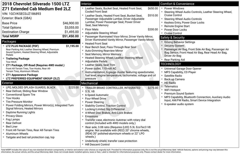 Black 2018 Chevrolet Silverado 1500 LTZ 2LZ 4WD 6-Speed Automatic Electronic with Overdrive EcoTec3 5.3L V8 6-Speed Automatic Electronic with Overdrive, 4WD, Jet Black Leather, 110-Volt AC Power Outlet, 150 Amp Alternator, 4-Wheel Disc Brakes, 4.2 Diagonal Color Display Driver Info Center, 40/20/40 Front Split Bench Seat, 6 Speaker Audio System, 6 Speakers, ABS brakes, Air Conditioning, All-Weather Floor Liner (LPO), Alloy wheels, AM/FM radio: SiriusXM, Auto-dimming door mirrors, Auto-Dimming Inside Rear-View Mirror, Auto-dimming Rear-View mirror, Automatic temperature control, Auxiliary External Transmission Oil Cooler, Bluetooth® For Phone, Bodyside moldings, Bose Speaker System, Brake assist, CD player, Chevrolet Connected Access, Chevrolet w/4G LTE, Chrome Bodyside Moldings, Chrome Cap Power-Adjustable Heated Outside Mirrors, Chrome Door Handles, Chrome Mirror Caps, Color-Keyed Carpeting w/Rubberized Vinyl Floor Mats, Compass, Deep-Tinted Glass, Delay-off headlights, Driver & Front Passenger Illuminated Vanity Mirrors, Driver door bin, Driver vanity mirror, Dual front impact airbags, Dual front side impact airbags, Dual-Zone Automatic Climate Control, Electric Rear-Window Defogger, Electronic Stability Control, Exterior Parking Camera Rear, EZ Lift & Lower Tailgate, Floor Mounted Console, Front anti-roll bar, Front Center Armrest w/Storage, Front Chrome Bumper, Front dual zone A/C, Front fog lights, Front Frame-Mounted Black Recovery Hooks, Front Full Feature Power Reclining Bucket Seats, Front License Plate Kit, Front reading lights, Front wheel independent suspension, Fully automatic headlights, Garage door transmitter, HD Radio, Heated & Vented Front Seating, Heated door mirrors, Heated Driver & Front Passenger Seats, Heated front seats, Heavy-Duty Rear Locking Differential, Illuminated entry, Integrated Trailer Brake Controller, Leather Appointed Seat Trim, Leather Wrapped Heated Steering Wheel, Leather Wrapped Steering Wheel w/Cruise Controls, LED Taillamps w/Signature, Low tire pressure warning, LTZ Plus Package, Manual Tilt/Telescoping Steering Column, Memory seat, Molded Black Splash Guards (LPO), Occupant sensing airbag, OnStar & Chevrolet Connected Services Capable, Outside temperature display, Overhead airbag, Overhead console, Panic alarm, Passenger door bin, Passenger vanity mirror, Power Adjustable Pedals, Power door mirrors, Power driver seat, Power passenger seat, Power Sliding Rear Window w/Defogger, Power steering, Power windows, Power Windows w/Driver Express Up, Premium audio system: Chevrolet MyLink, Radio data system, Radio: AM/FM 8 Diagonal Color Touch Screen, Rear 60/40 Folding Bench Seat (Folds Up), Rear Chrome Bumper, Rear reading lights, Rear step bumper, Rear Wheelhouse Liners, Rear window defroster, Remote Keyless Entry, Remote keyless entry, Remote Locking Tailgate, Remote Vehicle Starter System, Security system, Single Slot CD/MP3 Player, SiriusXM Satellite Radio, Speed control, Speed-sensing steering, Split folding rear seat, Spray-On Pickup Box Bed Liner, Steering Wheel Audio Controls, Steering wheel mounted audio controls, Tachometer, Telescoping steering wheel, Theft Deterrent System (Unauthorized Entry), Thin Profile LED Fog Lamps, Tilt steering wheel, Traction control, Trailering Package, Trip computer, Turn signal indicator mirrors, Ultrasonic Front & Rear Park Assist, Universal Home Remote, Variably intermittent wipers, Voltmeter, Wireless Charging, 6-Speed Automatic Electronic with Overdrive, 4WD, Jet Black Leather.