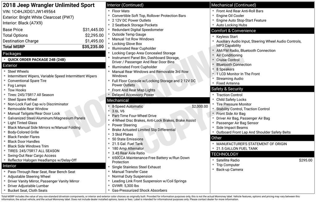 Bright White Clearcoat 2018 Jeep Wrangler Unlimited Sport 4WD 8-Speed Automatic 3.6L V6 24V VVT 1-Yr SiriusXM Radio Service, 21.5 Gallon Fuel Tank (DISC), 3.45 Rear Axle Ratio, 4-Wheel Disc Brakes, 8 Speakers, ABS brakes, Air Conditioning, AM/FM radio, Brake assist, Cloth Low-Back Bucket Seats, Compass, Delay-off headlights, Driver door bin, Driver vanity mirror, Dual front impact airbags, Dual front side impact airbags, Electronic Stability Control, For More Info, Call 800-643-2112, Front anti-roll bar, Front Bucket Seats, Front Center Armrest w/Storage, Front fog lights, Front reading lights, Integrated roll-over protection, Low tire pressure warning, Manufacturer's Statement of Origin (DISC), Non-Lock Fuel Cap w/o Discriminator, Normal Duty Suspension, Occupant sensing airbag, Outside temperature display, ParkView Rear Back-Up Camera, Passenger door bin, Passenger vanity mirror, Power steering, Quick Order Package 24B, Radio data system, Radio: Uconnect 3 w/5 Display, Rear anti-roll bar, Rear reading lights, SiriusXM Satellite Radio, Speed control, Split folding rear seat, Steering wheel mounted audio controls, Tachometer, Telescoping steering wheel, Tilt steering wheel, Traction control, Trip computer, Variably intermittent wipers, Wheels: 17 x 7.5 Black Steel Styled.
