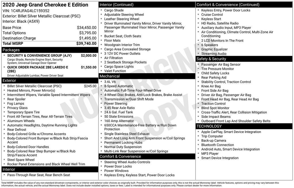 Billet Silver Metallic Clearcoat 2020 Jeep Grand Cherokee Laredo E 4WD 8-Speed Automatic 3.6L V6 24V VVT 4WD, 115V Auxiliary Power Outlet, 3.45 Rear Axle Ratio, 4-Wheel Disc Brakes, 6 Speakers, ABS brakes, Air Conditioning, Alloy wheels, AM/FM radio, Anti-whiplash front head restraints, Apple CarPlay, Apple CarPlay/Android Auto, Automatic temperature control, Brake assist, Bright Side Roof Rails, Bumpers: body-color, Cargo Compartment Cover, Cloth Bucket Seats, Compass, Delay-off headlights, Driver door bin, Driver vanity mirror, Dual front impact airbags, Dual front side impact airbags, Electronic Stability Control, Four wheel independent suspension, Front anti-roll bar, Front Bucket Seats, Front Center Armrest w/Storage, Front dual zone A/C, Front fog lights, Front reading lights, Fully automatic headlights, Google Android Auto, GPS Antenna Input, Heated door mirrors, Illuminated entry, Integrated Center Stack Radio, Integrated Voice Command w/Bluetooth®, Knee airbag, Leather Shift Knob, Low tire pressure warning, Normal Duty Suspension, Occupant sensing airbag, Outside temperature display, Overhead airbag, Overhead console, Panic alarm, ParkView Rear Back-Up Camera, Passenger door bin, Passenger vanity mirror, Power 4-Way Driver Lumbar Adjust, Power 8-Way Driver/Manual Passenger Seat, Power door mirrors, Power steering, Power windows, Quick Order Package 2BE Laredo E, Radio data system, Rear anti-roll bar, Rear reading lights, Rear seat center armrest, Rear window defroster, Rear window wiper, Remote keyless entry, Security & Convenience Group, Security Alarm, Speed control, Speed-sensing steering, Speed-Sensitive Wipers, Split folding rear seat, Spoiler, Steering Wheel Mounted Audio Controls, Steering wheel mounted audio controls, Tachometer, Telescoping steering wheel, Tilt steering wheel, Traction control, Trip computer, Universal Garage Door Opener, USB Host Flip, Variably intermittent wipers, Wheels: 17 x 8.0 Silver Aluminum, 4WD.
