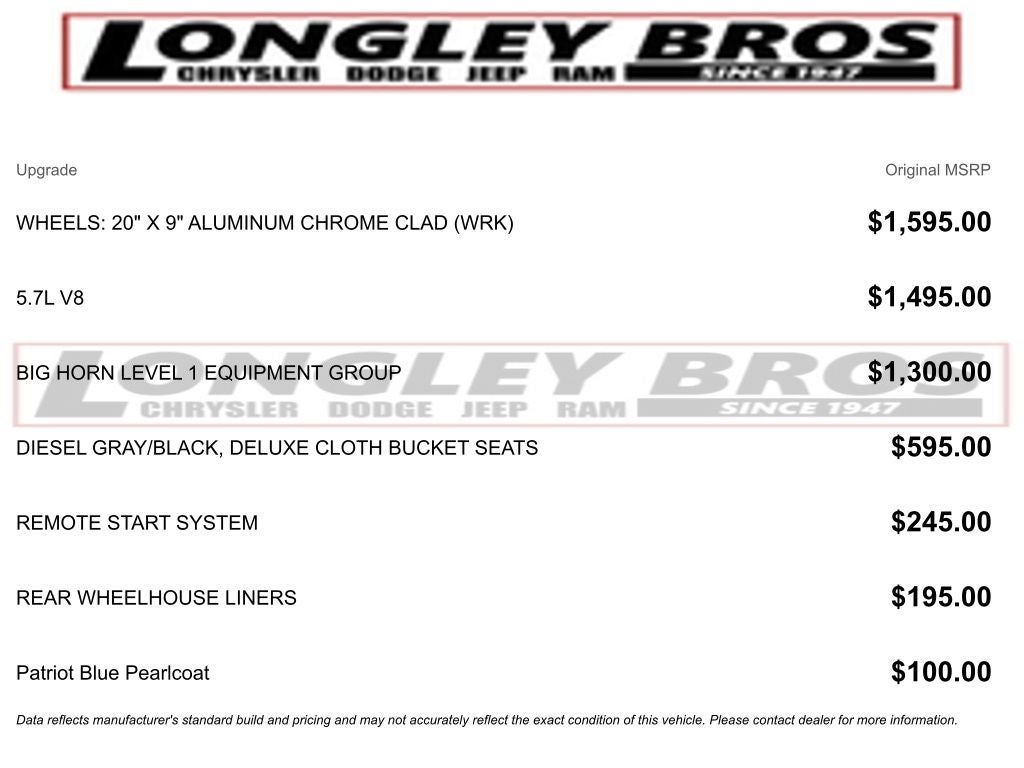 Patriot Blue Pearlcoat 2020 Ram 1500 Big Horn/Lone Star 4WD 8-Speed Automatic HEMI 5.7L V8 Multi Displacement VVT 3 Rear Seat Head Restraints, 3.21 Rear Axle Ratio, 4 Way Front Headrests, 4-Wheel Disc Brakes, 48V Belt Starter Generator, 6 Speakers, ABS brakes, Air Conditioning, Alloy wheels, AM/FM radio, Auto-Dimming Rear-View Mirror, Big Horn IP Badge, Big Horn Level 1 Equipment Group, Black Premium Power Mirrors, Brake assist, Bumpers: chrome, Class IV Receiver Hitch, Cloth Bench Seat, Cluster 3.5 TFT Color Display, Compass, Delay-off headlights, Driver door bin, Dual front impact airbags, Dual front side impact airbags, Electronic Stability Control, Foam Bottle Insert (Door Trim Panel), Front anti-roll bar, Front Center Armrest w/Storage, Front fog lights, Front reading lights, Front Seat Back Map Pockets, Front wheel independent suspension, Fully automatic headlights, Glove Box Lamp, GPS Antenna Input, Heated door mirrors, Illuminated entry, Leather steering wheel, Low tire pressure warning, Manual Adjust 4-Way Front Passenger Seat, Occupant sensing airbag, Outside temperature display, Overhead airbag, Overhead console, Panic alarm, ParkView Rear Back-Up Camera, Passenger door bin, Passenger vanity mirror, Power 4-Way Driver Lumbar Adjust, Power 8-Way Driver Seat, Power Adjustable Pedals, Power door mirrors, Power steering, Power windows, Quick Order Package 25Z Big Horn, Radio data system, Radio: Uconnect 3 w/5 Display, Radio: Uconnect 4 w/8.4 Display, Rear 60/40 Folding Seat, Rear anti-roll bar, Rear Dome w/On/Off Switch Lamp, Rear Power Sliding Window, Rear seat center armrest, Rear step bumper, Rear Wheelhouse Liners, Rear Window Defroster, Remote keyless entry, Remote Start System, SiriusXM Satellite Radio, Speed control, Split folding rear seat, Steering wheel mounted audio controls, Sun Visors w/Illuminated Vanity Mirrors, Tachometer, Telescoping steering wheel, Tilt steering wheel, Traction control, Trip computer, Universal Garage Door Opener, Variably intermittent wipers, Voltmeter, Wheels: 18 x 8 Cast-Aluminum Painted, Wheels: 20 x 9 Aluminum Chrome Clad (WRK).