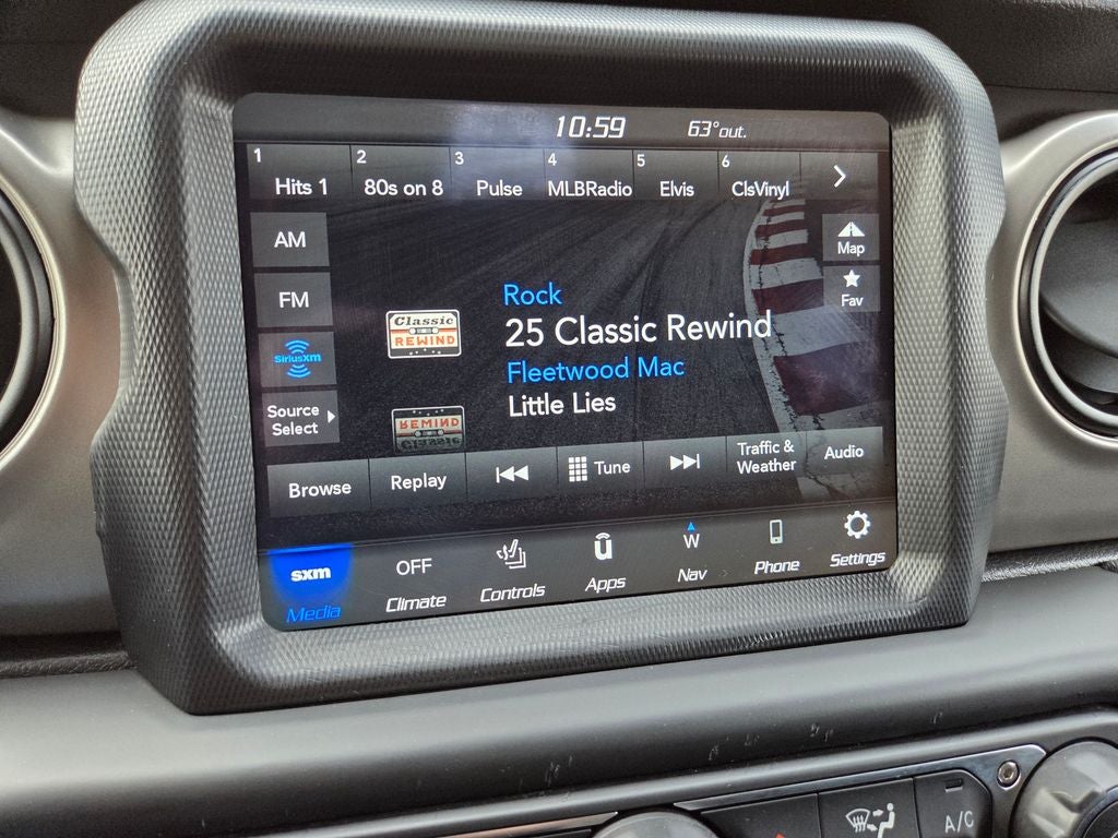 Hydro Blue Pearlcoat 2021 Jeep Gladiator Sport 4WD 8-Speed Automatic 3.6L V6 24V VVT 1-Year SiriusXM Guardian Trial, 110 mph Vehicle Max Speed Calibration, 115V Auxiliary Power Outlet, 220 Amp Alternator, 240 Amp Alternator, 3.73 Rear Axle Ratio, 4-Wheel Disc Brakes, 400W Inverter, 5-Year SiriusXM Traffic Service, 5-Year SiriusXM Travel Link Service, 7.0 Touch Screen Display, 8 Speakers, 8.4 Radio & Premium Audio Group, 8.4 Touchscreen Display, ABS brakes, Air Conditioning, Air Conditioning w/Auto Temperature Control, Alpine Premium Audio System, AM/FM radio, Anti-Lock 4-Wheel Disc Heavy Duty Brakes, Apple CarPlay, Auto-Dimming Rear-View Mirror, Automatic Headlamps, Black 3-Piece Hard Top, Blind Spot & Cross Path Detection, Body Color Fender Flares (2-Piece), Brake assist, Class IV Hitch Receiver, Cloth Low-Back Bucket Seats, Cluster 7.0 TFT Color Display, Cold Weather Group, Compass, Console Bin Task Light, Convenience Group, Daytime Running Lamp System, Deep Tint Sunscreen Windows, Delay-off headlights, Driver door bin, Driver vanity mirror, Dual front impact airbags, Dual front side impact airbags, Dual Top Group, Electronic Stability Control, Emergency/Assistance Call, For Details, Visit DriveUconnect.com, For More Info, Call 800-643-2112, Freedom Panel Storage Bag, Front 1-Touch Down Power Windows, Front anti-roll bar, Front Bucket Seats, Front Center Armrest w/Storage, Front fog lights, Front reading lights, Google Android Auto, GPS Antenna Input, GPS Navigation, HD Radio, Heavy-Duty Engine Cooling, Integrated Center Stack Radio, Integrated roll-over protection, Integrated Voice Command w/Bluetooth®, Leather Wrapped Steering Wheel, LED Taillamps, Low tire pressure warning, Manufacturer's Statement of Origin, Media Hub w/2 Charge Only USBs, Molded in Color Bumper w/Accent Color, MOPAR Spray In Bedliner, No Soft Top, Normal Duty Plus Suspension, Normal Duty Suspension, Occupant sensing airbag, Off-Road Info Pages, Outside temperature display, ParkSense Rear Park Assist System, ParkView Rear Back-Up Camera, Passenger door bin, Passenger vanity mirror, Popular Equipment Package, Power Heated Mirrors, Power steering, Power Tailgate Lock, Quick Order Package 24S Sport S, Radio data system, Radio: Uconnect 3 w/5 Display, Radio: Uconnect 4 w/7 Display, Radio: Uconnect 4C Nav w/8.4 Display, Rear anti-roll bar, Rear reading lights, Rear Sliding Window, Rear Window Defroster, Remote Keyless Entry, Roll-Up Tonneau Cover, Safety Group, Security Alarm, SiriusXM Radio Service, SiriusXM Satellite Radio, SiriusXM Traffic Plus, SiriusXM Travel Link, Speed control, Speed Sensitive Power Locks, Split folding rear seat, Sport S, Steering wheel mounted audio controls, Sun Visors w/Illuminated Vanity Mirrors, Tachometer, Technology Group, Telescoping steering wheel, Tilt steering wheel, Traction control, Trailer Hitch Zoom, Trailer Tow Package, Trip computer, USB Host Flip, Variably intermittent wipers, Wheels: 17 x 7.5 Black Steel Styled, Wheels: 17 x 7.5 Tech Silver Alum (DISC).