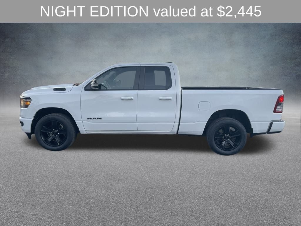 Bright White Clearcoat 2022 Ram 1500 Big Horn/Lone Star 4WD 8-Speed Automatic HEMI 5.7L V8 Multi Displacement VVT 115V Auxiliary Power Outlet, 115V Auxiliary Rear Power Outlet, 3 Rear Seat Head Restraints, 3.21 Rear Axle Ratio, 4 Way Front Headrests, 4-Wheel Disc Brakes, 400W Inverter, 48V Belt Starter Generator, 4G LTE Wi-Fi Hot Spot, 6 Speakers, 8.4 Touchscreen Display, ABS brakes, Accent Color Premium Power Mirrors, Air Conditioning, Air Conditioning ATC w/Dual Zone Control, Alloy wheels, AM/FM radio, Anti-Spin Differential Rear Axle, Apple CarPlay, Auto-Dimming Exterior Driver Mirror, Auto-Dimming Rear-View Mirror, Big Horn Badge, Big Horn Level 2 Equipment Group, Black Exterior Mirrors, Black Exterior Truck Badging, Black Headlamp Bezels, Black Interior Accents, Black Painted Exterior Mirrors Caps, Black Premium Power Mirrors, Bluetooth® Handsfree Phone & Audio, Body Color Front Bumper, Body Color Rear Bumper w/Step Pads, Brake assist, Bucket Seats, Bumpers: chrome, Class IV Receiver Hitch, Cloth Bench Seat, Cluster 7.0 TFT Color Display, Compass, Connectivity - US/Canada, Convex Wide-Angle Mirror Insert, Delay-off headlights, Delete LED Lamp - Floor Console Bin, Deluxe Cloth Bucket Seats, Driver door bin, Dual Exhaust w/Black Tips, Dual front impact airbags, Dual front side impact airbags, Electronic Stability Control, Emergency communication system: SiriusXM Guardian, Exterior Mirrors Courtesy Lamps, Exterior Mirrors w/Heating Element, Exterior Mirrors w/Supplemental Signals, For Details, Visit DriveUconnect.com, For More Info, Call 800-643-2112, Front anti-roll bar, Front Center Armrest w/Storage, Front fog lights, Front License Plate Bracket, Front reading lights, Front Seat Back Map Pockets, Front wheel independent suspension, Full Length Floor Console, Fully automatic headlights, Global Telematics Box Module (TBM), Glove Box Lamp, Google Android Auto, GPS Antenna Input, Grille Surround 1 Black Texture 2 Black, Heated door mirrors, Heated Front Seats, Heated Steering Wheel, Illuminated entry, Integrated Center Stack Radio, Integrated Voice Command w/Bluetooth®, Leather steering wheel, Low tire pressure warning, Manual Adjust 4-Way Front Passenger Seat, Media Hub w/2 Charge Only USBs, MOPAR Front & Rear Rubber Floor Mats, Night Edition, Occupant sensing airbag, Outside temperature display, Overhead airbag, Overhead console, Panic alarm, ParkSense Front/Rear Park Assist w/Stop, ParkView Rear Back-Up Camera, Passenger door bin, Passenger vanity mirror, Power 2-Way Driver Lumbar Adjust, Power 8-Way Driver Seat, Power Adjustable Pedals, Power door mirrors, Power steering, Power windows, Power-Folding Mirrors, Quick Order Package 25Z Big Horn, Radio data system, Radio: Uconnect 3 w/5 Display, Radio: Uconnect 5 W w/8.4 Display, Rear 60/40 Folding Seat, Rear anti-roll bar, Rear Dome w/On/Off Switch Lamp, Rear Power Sliding Window, Rear seat center armrest, Rear step bumper, Rear Wheelhouse Liners, Rear Window Defroster, Remote keyless entry, Remote Start System, Security Alarm, SiriusXM Radio Service, SiriusXM Satellite Radio, Speed control, Split folding rear seat, Steering wheel mounted audio controls, Sun Visors w/Illuminated Vanity Mirrors, Tachometer, Telescoping steering wheel, Tilt steering wheel, Traction control, Trip computer, Universal Garage Door Opener, USB Host Flip, Variably intermittent wipers, Voltmeter, Wheels: 18 x 8 Cast-Aluminum Painted, Wheels: 20 x 9.0 Premium Paint/Polished.