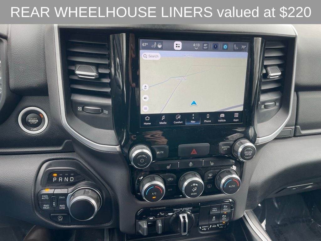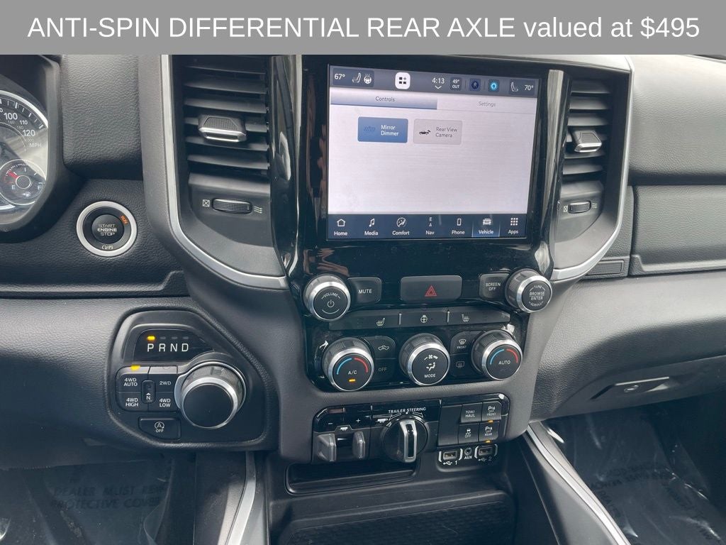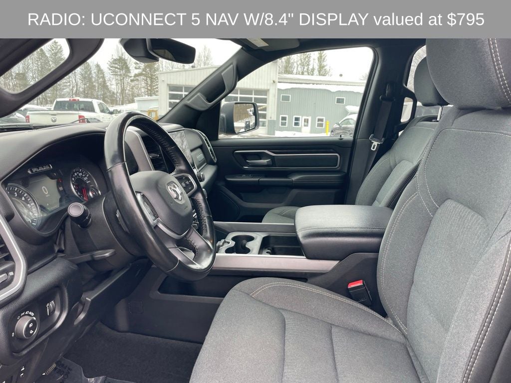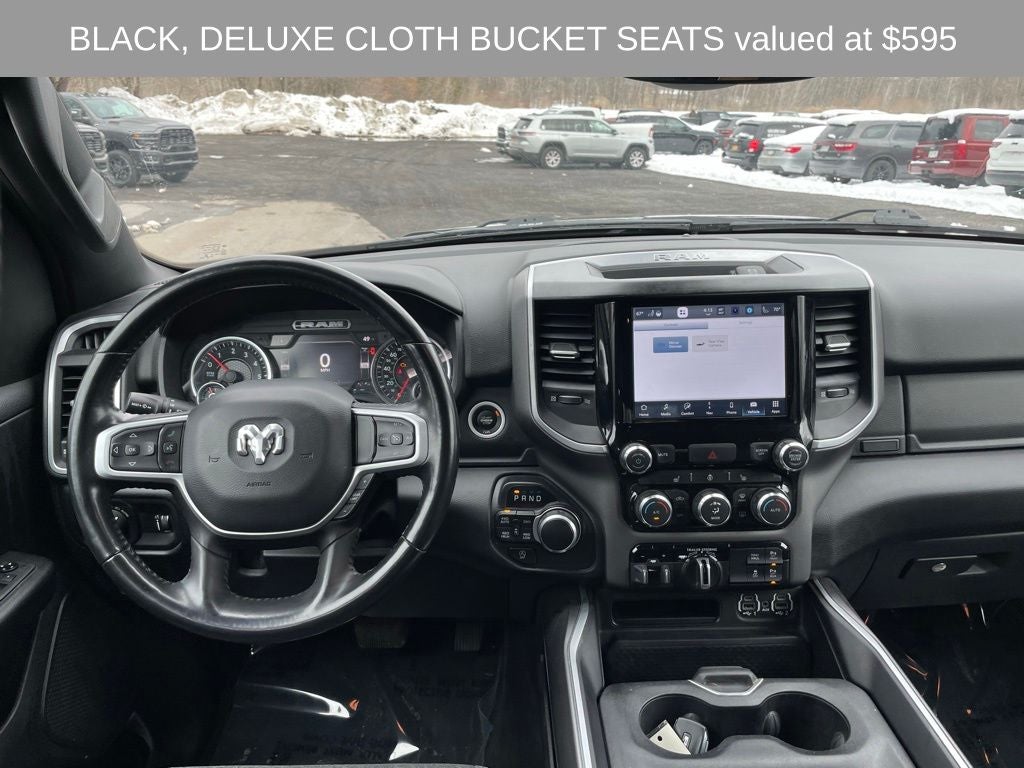 Diamond Black Crystal Pearlcoat 2022 Ram 1500 Big Horn/Lone Star 4WD 8-Speed Automatic HEMI 5.7L V8 Multi Displacement VVT 115V Auxiliary Power Outlet, 115V Auxiliary Rear Power Outlet, 26 Gal. Fuel Tank (Replace 23 Gal.) (DISC), 2nd Row In Floor Storage Bins, 3 Rear Seat Head Restraints, 3.21 Rear Axle Ratio, 4 Way Front Headrests, 4-Wheel Disc Brakes, 400W Inverter, 48V Belt Starter Generator, 4G LTE Wi-Fi Hot Spot, 6 Speakers, 8.4 Touchscreen Display, ABS brakes, Air Conditioning, Air Conditioning ATC w/Dual Zone Control, All R1 High Radios, All Radio Equipped Vehicles, Alloy wheels, AM/FM radio, Anti-Spin Differential Rear Axle, Apple CarPlay, Auto-Dimming Exterior Driver Mirror, Auto-Dimming Rear-View Mirror, Big Horn Badge, Big Horn Level 2 Equipment Group, Black Exterior Mirrors, Black Exterior Truck Badging, Black Headlamp Bezels, Black Interior Accents, Black Premium Power Mirrors, Bluetooth® Handsfree Phone & Audio, Body Color Front Bumper, Body Color Rear Bumper w/Step Pads, Brake assist, Bucket Seats, Bumpers: chrome, Class IV Receiver Hitch, Cloth Bench Seat, Cluster 7.0 TFT Color Display, Compass, Connected Travel & Traffic Services, Connectivity - US/Canada, Convex Wide-Angle Mirror Insert, Delay-off headlights, Delete LED Lamp - Floor Console Bin, Deluxe Cloth Bucket Seats, Disassociated Touchscreen Display, Driver door bin, Dual Exhaust w/Black Tips, Dual front impact airbags, Dual front side impact airbags, Electronic Stability Control, Emergency communication system: SiriusXM Guardian, Exterior Mirrors Courtesy Lamps, Exterior Mirrors w/Heating Element, Exterior Mirrors w/Supplemental Signals, For Details, Visit DriveUconnect.com, Front anti-roll bar, Front Center Armrest w/Storage, Front fog lights, Front License Plate Bracket, Front reading lights, Front Seat Back Map Pockets, Front wheel independent suspension, Full Length Floor Console, Fully automatic headlights, Global Telematics Box Module (TBM), Glove Box Lamp, Google Android Auto, GPS Antenna Input, GPS Navigation, HD Radio, Heated door mirrors, Heated Front Seats, Heated Steering Wheel, Heavy-Duty Engine Cooling, Illuminated entry, Integrated Center Stack Radio, Integrated Voice Command w/Bluetooth®, Leather steering wheel, Low tire pressure warning, Manual Adjust 4-Way Front Passenger Seat, Manufacturer's Statement of Origin, Media Hub w/2 Charge Only USBs, MOPAR Front & Rear Rubber Floor Mats, Night Edition (DISC), Occupant sensing airbag, Outside temperature display, Overhead airbag, Overhead console, Panic alarm, ParkSense Front/Rear Park Assist w/Stop, ParkView Rear Back-Up Camera, Passenger door bin, Passenger vanity mirror, Power 2-Way Driver Lumbar Adjust, Power 8-Way Driver Seat, Power Adjustable Pedals, Power door mirrors, Power steering, Power windows, Power-Folding Mirrors, Quick Order Package 27Z Big Horn, Radio data system, Radio: Uconnect 3 w/5 Display, Radio: Uconnect 5 Nav w/8.4 Display, Radio: Uconnect 5 W w/8.4 Display, Rear 60/40 Folding Seat, Rear anti-roll bar, Rear Center Armrest, Rear Dome w/On/Off Switch Lamp, Rear Power Sliding Window, Rear seat center armrest, Rear step bumper, Rear Wheelhouse Liners, Rear Window Defroster, Remote keyless entry, Remote Start System, Security Alarm, SiriusXM Radio Service, SiriusXM Satellite Radio, SiriusXM w/360L, Speed control, Split folding rear seat, Steering wheel mounted audio controls, Sun Visors w/Illuminated Vanity Mirrors, Tachometer, Telescoping steering wheel, Tilt steering wheel, Traction control, Trailer Brake Control, Trailer Light Check, Trailer Tire Pressure Monitoring System, Trailer Tow Group, Trip computer, Universal Garage Door Opener, USB Host Flip, Variably intermittent wipers, Voltmeter, Wheels: 18 x 8 Cast-Aluminum Painted, Wheels: 20 x 9.0 Premium Paint/Polished (DISC).