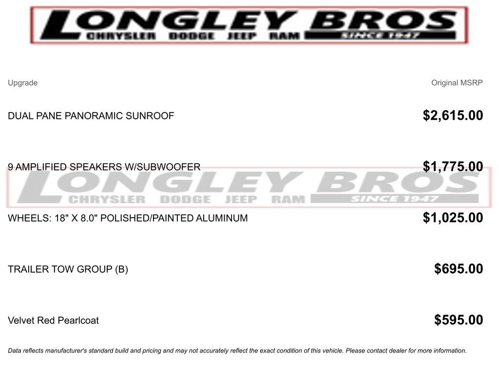 Velvet Red Pearlcoat 2023 Jeep Grand Cherokee L Limited 4WD 8-Speed Automatic 3.6L V6 24V VVT 220 Amp Alternator, 3.45 Rear Axle Ratio, 3rd row seats: split-bench, 4-Wheel Disc Brakes, 506 Watt Amplifier, 6 Speakers, 9 Amplified Speakers w/Subwoofer, ABS brakes, Active Noise Control System, Air Conditioning, Alloy wheels, AM/FM radio: SiriusXM with 360L, Anti-whiplash front head restraints, Audio memory, Auto High-beam Headlights, Automatic Headlamp Leveling System, Automatic temperature control, Brake assist, Bumpers: body-color, Capri Leatherette Seats, Compass, Delay-off headlights, Driver door bin, Driver vanity mirror, Dual front impact airbags, Dual front side impact airbags, Dual-Pane Panoramic Sunroof, Electronic Stability Control, Emergency communication system, Four wheel independent suspension, Front anti-roll bar, Front Bucket Seats, Front Center Armrest w/Storage, Front dual zone A/C, Front fog lights, Front License Plate Bracket, Front reading lights, Fully automatic headlights, Garage door transmitter, Heated door mirrors, Heated front seats, Heated rear seats, Heated steering wheel, Heavy-Duty Engine Cooling, Illuminated entry, Interior Rear Facing Camera, Knee airbag, Low tire pressure warning, Manual Fold Seatbacks, Memory seat, Molded In Color Black/Gloss Black Roof Rails, Navigation System, Normal Duty Suspension, Occupant sensing airbag, Outside temperature display, Overhead airbag, Overhead console, Panic alarm, ParkView Rear Back-Up Camera, Passenger door bin, Passenger vanity mirror, Power door mirrors, Power driver seat, Power Liftgate, Power passenger seat, Power steering, Power windows, Quick Order Package 23E, Radio data system, Radio: Uconnect 5 Nav w/10.1 Display, Rear air conditioning, Rear anti-roll bar, Rear Load Leveling Suspension, Rear reading lights, Rear window defroster, Rear window wiper, Reclining 3rd row seat, Remote keyless entry, Security system, Speed control, Speed-Sensitive Wipers, Split folding rear seat, Spoiler, Steering wheel mounted audio controls, Tachometer, Telescoping steering wheel, Tilt steering wheel, Traction control, Trailer Hitch Zoom, Trailer Tow Group (B) (DISC), Trip computer, Turn signal indicator mirrors, Variably intermittent wipers, Voltmeter, Wheels: 18 x 8.0 Fully Painted Aluminum, Wheels: 18 x 8.0 Polished/Painted Aluminum.