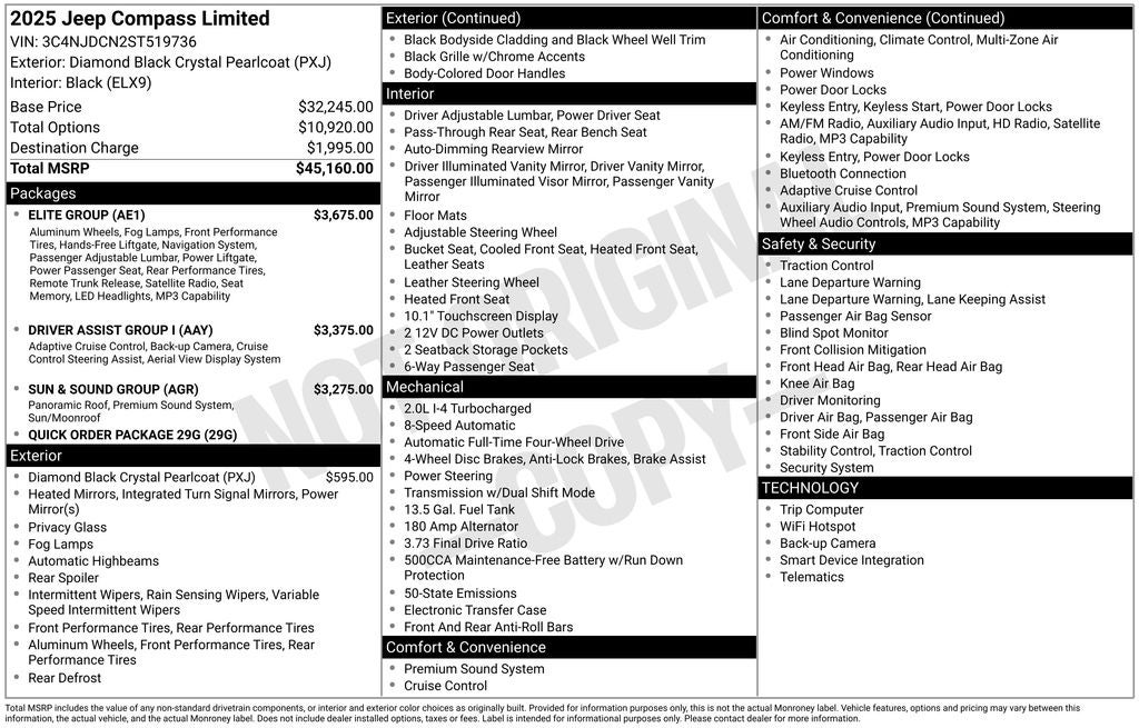 Diamond Black Crystal Pearlcoat 2025 Jeep Compass Limited 4WD 8-Speed Automatic 2.0L I4 DOHC 4WD, 10.1 Touchscreen Display, 2nd Row USB Type A/C Charge Only, 3.73 Final Drive Ratio, 360 Surround View Camera System, 4-Wheel Disc Brakes, 6 Speakers, ABS brakes, Active Driving Assist System, Air Conditioning, Alexa Built-In, Alloy wheels, AM/FM radio: SiriusXM, Apple CarPlay/Android Auto, Auto High-beam Headlights, Auto-dimming Rear-View mirror, Automatic temperature control, Brake assist, Bumpers: body-color, Cluster 10.25 TFT Color Display, Compass, Connected Travel & Traffic Services, Delay-off headlights, Diamond Black Door Cladding, Diamond Black Exterior Sill, Diamond Black Fascias, Diamond Black Wheel Flares, Driver Assist Group I, Driver door bin, Driver Seat Memory, Driver vanity mirror, Dual front impact airbags, Dual front side impact airbags, Electronic Stability Control, Elite Group, Emergency communication system: Jeep Connect, Foot Activated Open 'N Go Liftgate, Four wheel independent suspension, Front anti-roll bar, Front Bucket Seats, Front Center Armrest w/Storage, Front dual zone A/C, Front fog lights, Front reading lights, Fully automatic headlights, GPS Navigation, HD Radio, Heated door mirrors, Heated front seats, Illuminated entry, Integrated Voice Command w/Bluetooth®, Knee airbag, Leather Shift Knob, Leather steering wheel, Leatherette Seats, LED Low/Highbeam Projector Headlamps, Low tire pressure warning, Occupant sensing airbag, Outside temperature display, Overhead airbag, Overhead console, Panic alarm, ParkView Rear Back-Up Camera, Passenger door bin, Passenger vanity mirror, Power 2-Way Passenger Lumbar Adjust, Power 8-Way Adjust Front Passenger Seat, Power door mirrors, Power driver seat, Power Front/Fixed Rear Full Sunroof, Power Liftgate, Power steering, Power windows, Premium Alpine Speaker System, Premium audio system: UConnect 5, Premium Leather Trimmed Bucket Seats, Premium LED Fog Lamps, Premium Taillamps, Quick Order Package 29G, Radio: Uconnect 5 w/10.1 Display, Rain sensing wipers, Rear anti-roll bar, Rear seat center armrest, Rear window defroster, Rear window wiper, Remote keyless entry, Reversible Carpet/Vinyl Cargo Mat, Security system, SiriusXM w/360L, Speed control, Split folding rear seat, Spoiler, Steering wheel mounted audio controls, Sun & Sound Group, Tachometer, Telescoping steering wheel, Tilt steering wheel, Traction control, Traffic Sign Recognition, Trip computer, Turn signal indicator mirrors, Variably intermittent wipers, Ventilated Front Seats, Wheels: 18 x 7 Painted Diamond Cut Alum (DISC), Wheels: 19 x 7.5 Painted Diamond Cut Aluminum, Wireless Charging Pad, 4WD.