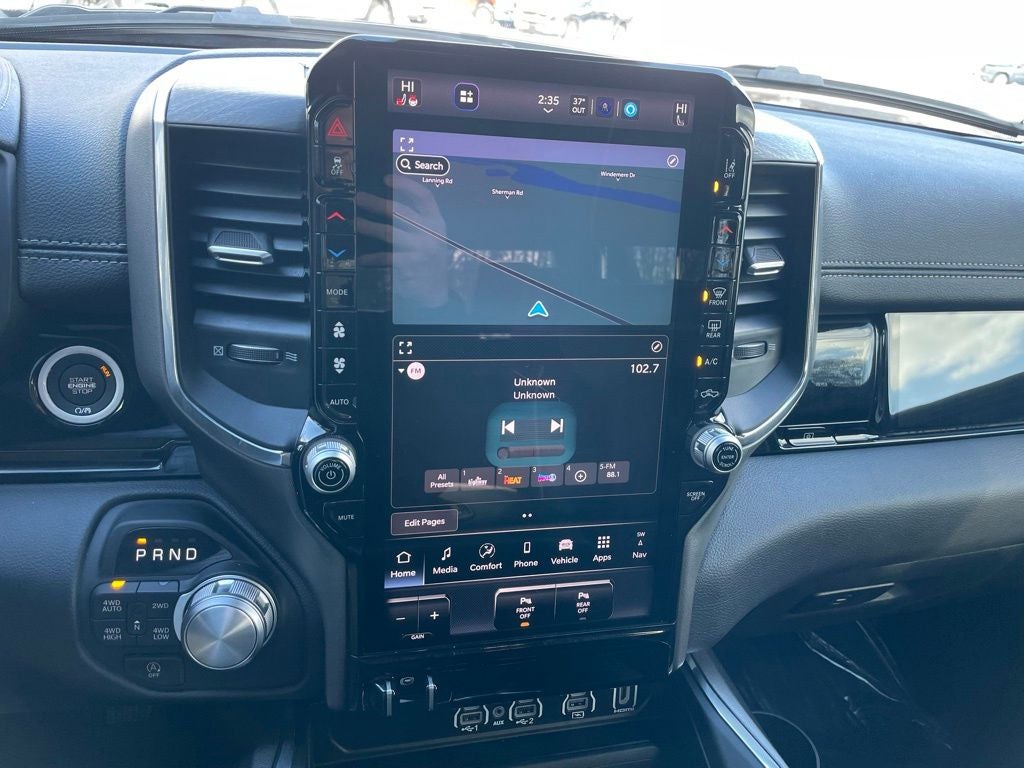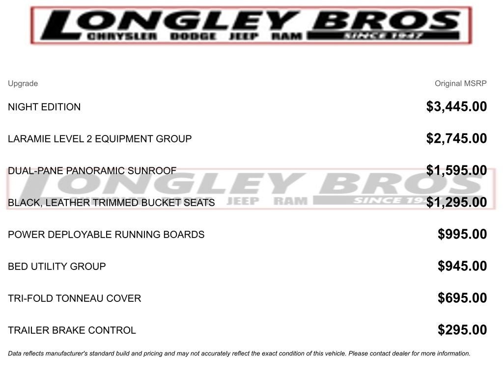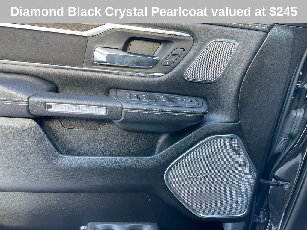 Diamond Black Crystal Pearlcoat 2025 Ram 1500 Laramie 4WD 8-Speed Automatic 3.0L I6 #1 Seat Foam Cushion, 10 Speakers, 14.4 Touchscreen Display, 3 Rear Seat Head Restraints, 3.55 Rear Axle Ratio, 4 Way Front Headrests, 4-Wheel Disc Brakes, 4G LTE Wi-Fi Hot Spot, ABS brakes, Accent Color Door Handles, Accent Color Premium Power Mirrors, Accent Color Tailgate Handle, Air Conditioning, Alloy wheels, AM/FM radio: SiriusXM with 360L, Anti-Spin Differential Rear Axle, Apple CarPlay, Apple CarPlay/Android Auto, Audio memory, Auto High-beam Headlights, Auto Power-Folding Mirrors, Auto-dimming door mirrors, Auto-Dimming Exterior Driver Mirror, Auto-dimming Rear-View mirror, Automatic temperature control, Bed Utility Group, Black Exterior Truck Badging, Black Headlamp Bezels, Black Interior Accents, Black Painted Exterior Mirrors Caps, Black Tail Lamp Bezels, Body Color Front Bumper, Body Color Rear Bumper w/Step Pads, Brake assist, Bucket Seats, Bumpers: chrome, Center Console Parts Module, Chrome Exterior Mirrors, Cluster 12 TFT Color Display, Compass, Connected Travel & Traffic Services, Connectivity - US/Canada, Convex Wide-Angle Exterior Mirror Insert, Delay-off headlights, Dome Dual LED Reading Lamp, Driver door bin, Driver Seat Memory, Driver vanity mirror, Dual Exhaust w/Black Tips, Dual front impact airbags, Dual front side impact airbags, Dual-Pane Panoramic Sunroof, Electronic Stability Control, Exterior Mirrors Approach Lamps, Exterior Mirrors Courtesy Lamps, Exterior Mirrors w/Heating Element, Exterior Mirrors w/Memory, Exterior Mirrors w/Supplemental Signals, Front anti-roll bar, Front Center Armrest w/Storage, Front dual zone A/C, Front fog lights, Front reading lights, Front Seat Back Map Pockets, Front wheel independent suspension, Full Length Upgraded Floor Console, Fully automatic headlights, Garage door transmitter, Google Android Auto, GPS Antenna Input, GPS Navigation, Grille Surround 3 Black Texture 2 Black, harman/kardon 19 Speaker Premium Sound, HD Radio, Heated door mirrors, Heated Front Seats, Heated front seats, Heated rear seats, Heated Second Row Seats, Heated Steering Wheel, Heated steering wheel, Illuminated entry, Integrated Voice Command w/Bluetooth®, Laramie Level 2 Equipment Group, Leather steering wheel, Leather Trim 40/20/40 Bench Seat, Leather Trimmed Bucket Seats, LED Dome/Reading Lamp, Low tire pressure warning, Manufacturer's Statement of Origin, Memory seat, MOPAR 4 Adjustable Cargo Tie-Down Hooks, MOPAR Spray In Bedliner, Navigation System, Night Edition, Occupant sensing airbag, Outside temperature display, Overhead airbag, Overhead console, Panic alarm, ParkView Rear Back-Up Camera, Passenger door bin, Passenger vanity mirror, Pirelli Brand Tires, Power 2-Way Driver Lumbar Adjust, Power 2-Way Passenger Lumbar Adjust, Power Adjust 8-Way Driver Seat, Power Adjust 8-Way Front Passenger Seat, Power Deployable Running Boards, Power door mirrors, Power driver seat, Power passenger seat, Power steering, Power Tailgate, Power windows, Proximity Approach/Departure Lamps, Quick Order Package 21H Laramie, Radio data system, Radio: Uconnect 5 Nav w/12.0 Display, Radio: Uconnect 5 Nav w/14.4 Display, Rain Sensitive Windshield Wipers, RAM Grille Badge - Black, RAM Grille Badge - Chrome, Rear 60/40 Folding Split Recline Seat, Rear anti-roll bar, Rear reading lights, Rear seat center armrest, Rear step bumper, Remote keyless entry, Security system, SiriusXM w/360L, Speed control, Split folding rear seat, Sport Performance Hood, Steering wheel mounted audio controls, Tachometer, Telescoping steering wheel, Tilt steering wheel, Traction control, Trailer Brake Control, Tri-Fold Tonneau Cover, Trip computer, Turn signal indicator mirrors, USB Host Flip, Variably intermittent wipers, Ventilated Front Seats, Ventilated front seats, Voltmeter, Wheels: 20 x 9 Premium Paint